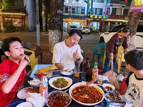 午後3時過ぎ、ついに安徽省の人気のドライブルート“皖南川蔵線”の東入口に到着しました。ここにある2軒の小店は繁盛しており、店主は笑顔で“どちらも僕の店で、自由に座ればよい”と声をかけてくれました。子供たちが好みのブランドのインスタントラーメンを選び、主人と私は郷土料理を注文しました。空腹だった4人は美味しく食事を済ませて、店を出る時、子供たちはさらに2本ソーセージを買いました。
