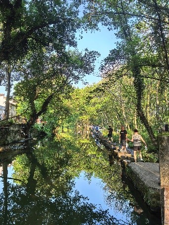村にある観光スポットの名は“綠野仙踪”(緑のオズの魔法使い)です。この名前は映画<オズの魔法使い>に由来したかなと思います。入場料が無料で、川に架かる石橋を渡ると、林がある湿地で散歩することができます。川は幅が広く、遊覧船や竹筏での喫茶などの有料プロジェクトもあります。川の沿いには子供の水遊び用具、干物、手工芸品などがずっらりで、人込みがありにぎやかな市街地になっていました。子供たちは騒ぎをして、泣いたり笑ったり、ここで半日を過ぎました。12時、民宿に戻りチェックアウトし、高速道路に入る前に“徽州料理”(安徽省の地元料理)を食べて、昆山市へ向かい