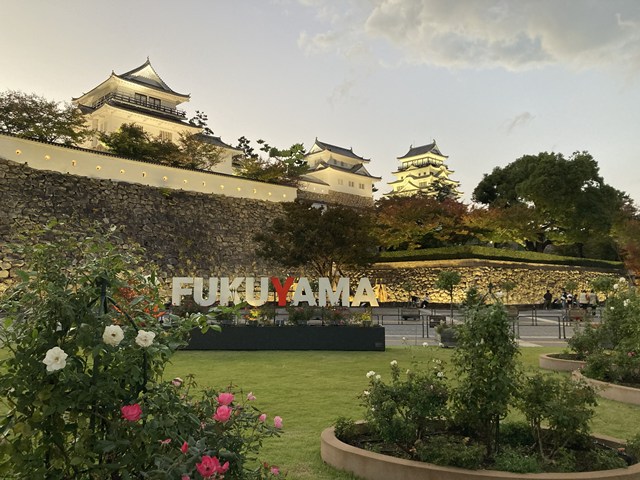 今治に着いてから,街中華で今治のB級グルメで名前そのままの焼豚玉子飯を頂き,その後しまなみ温泉喜助の湯で汗を流し,自転車を畳んで輪行バックに入れてサポカーに積み込み,帰りは次男にしまなみ海道を車で福山まで送ってもらいました.福山駅では1時間半ほどの待ち時間があったのですが,夕暮れ時にライトアップされて白く浮き上がった福山城とバラのゲートのコントラストはまるで童話の世界のように美しかったです.