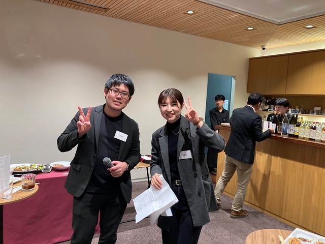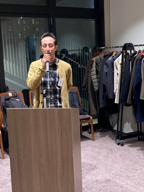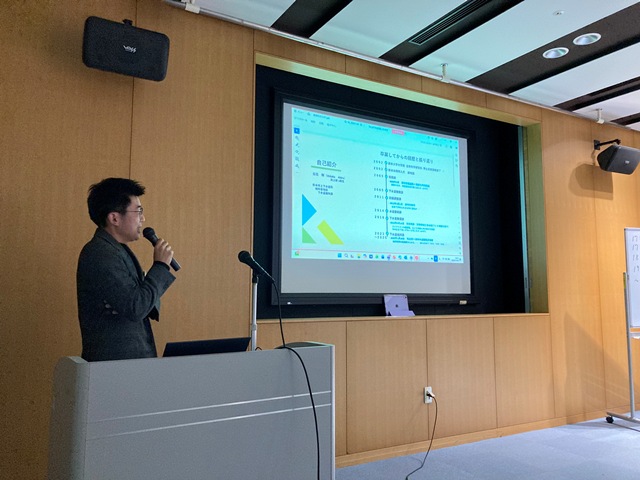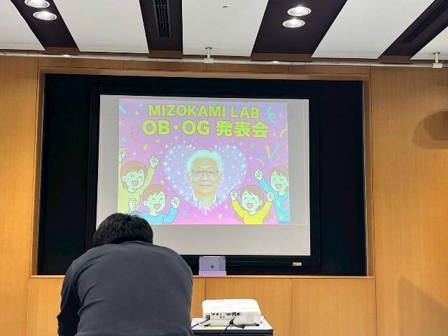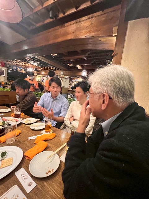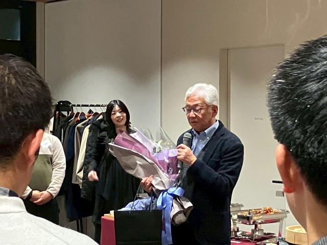 パーティだけというのでは面白くないので,私のたっての希望で卒業生に在学中の思い出や職場での活動などを3人のOB/OGに話してもらう機会を設けてもらいました.一人目は熊本市上下水道局の日高君で,インフラの老朽化と人材不足に対応した局内での業務改善や人材育成の活動を紹介してくれました.在学中も就職直後も少しひ弱な感じもあった日高君ですが,課長職になり立派になったなという感想です.2人目はゴダイベストの森さんです.彼は構造計画研究所在職時に一緒に仕事をしていた頃に社会人博士課程に勧誘し,その後,多くの共同研究を行ってきました.フランスへの視察の経験や共同開発したMAUMSの発展可能性について発表しいてくれました.最後は福山コンサルタントの天藤さんで卒論や修論時の苦労が現在の業務にとても役立っていることなどを紹介してくれました.最近ご結婚されたようでおめでとうございます.