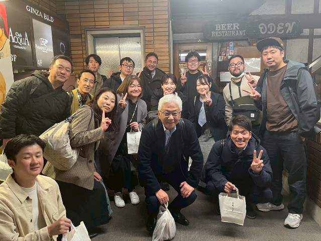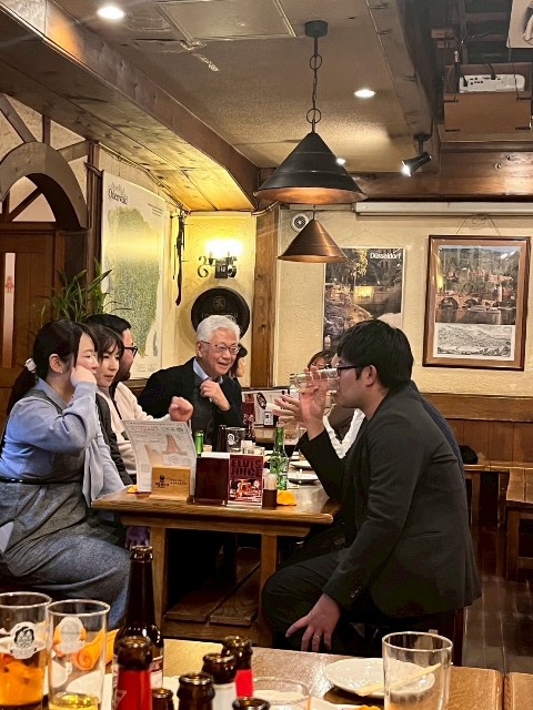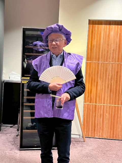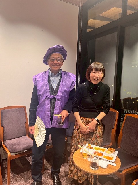 場所を紅蘭亭に移したお祝いパーティでは,久しぶりに会ったOB/OG同士での会話が弾みました.還暦は赤,古希は紫なのでしょうか,予め用意してくれていた紫のチャンチャンコと帽子をかぶってピース!ちょっと恥ずかしかったのですが,とてもよく似合っているのは何というべきか・・・,さすが紅蘭亭!同じ唐揚げやエビチリではあっても,街中華とはまた違って気品高く,美味しい中華料理でした.また,私が会場に持ち込んだ最高級紹興酒は絶品で,参加者に評判でした.これは9月に上海を訪問した際に高さんからお土産に頂いたものです.その後,場所を銀座通りのビアハウスオーデンに移し,各国のビールとドイツ料理で2次会を楽しみました.ここでも大盛り上がりで,気が付くと翌日になる直前となっていました,