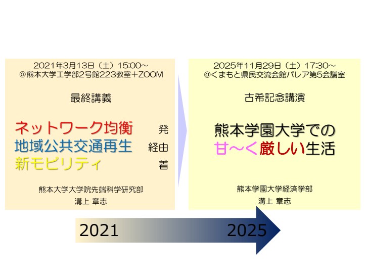 私自身も,熊大退職時に行った最終講義「ネットワーク均衡 発 地域公共交通再生 経由 新モビリティ 着」の続きの「熊本学園大学での甘―く厳しい生活」という発表をしました.ミクロ経済学や公共政策学を教える中で,「過密・地価高騰などの都市問題や混雑・環境などの交通問題は外部不経済を生じさせる典型的な市場の失敗であり,都市・交通政策はそれを内部化するための手法と手続きである,」といった,判で押して額に入れたような理解を改めて悟ったことを話しました.